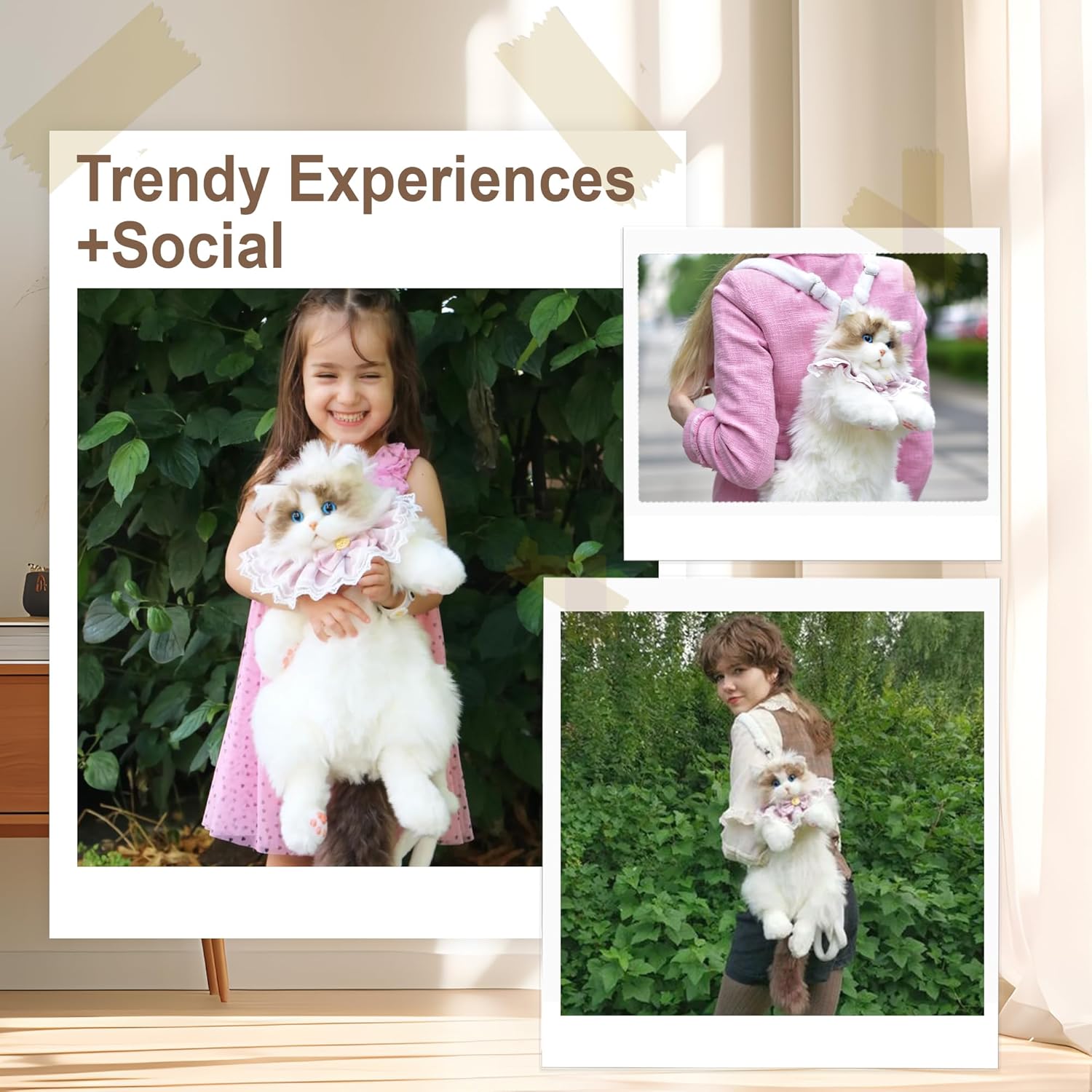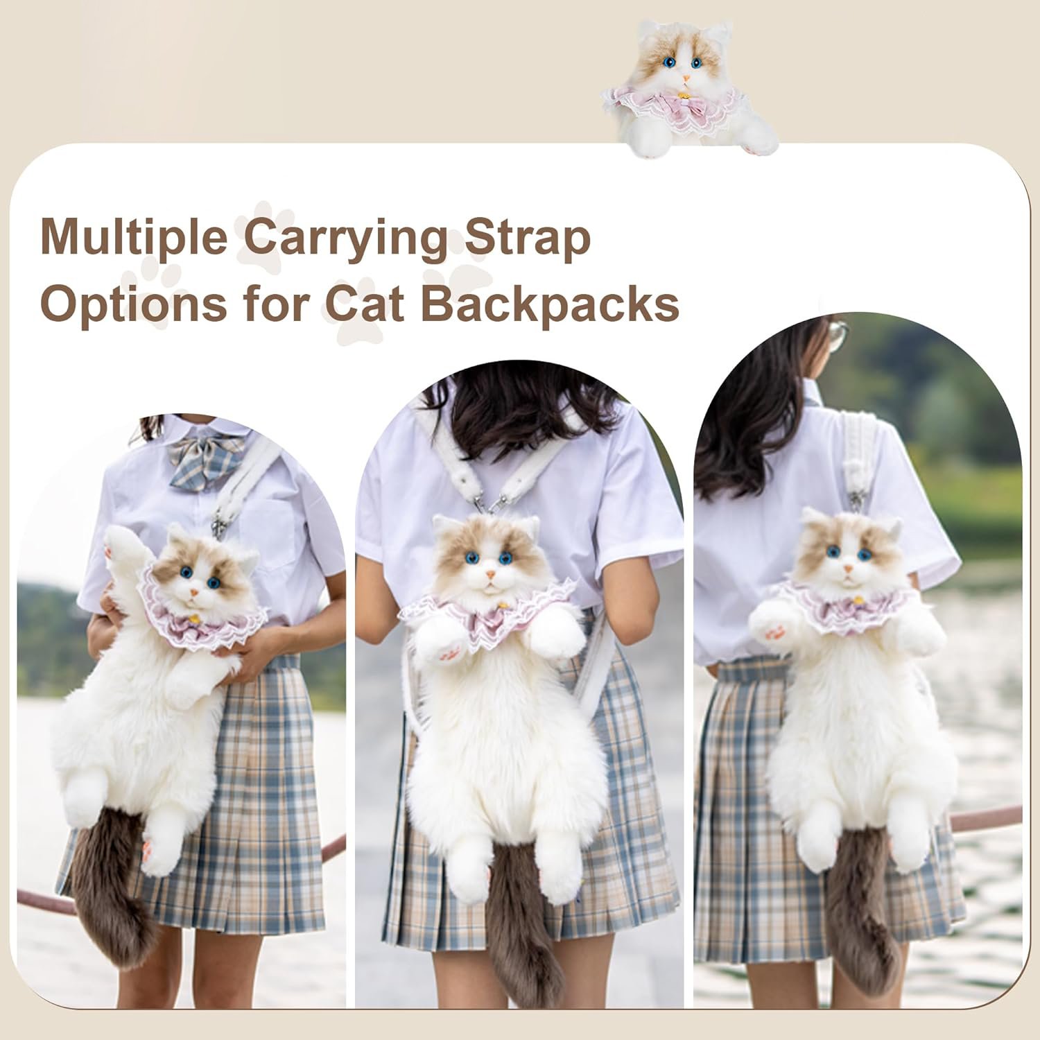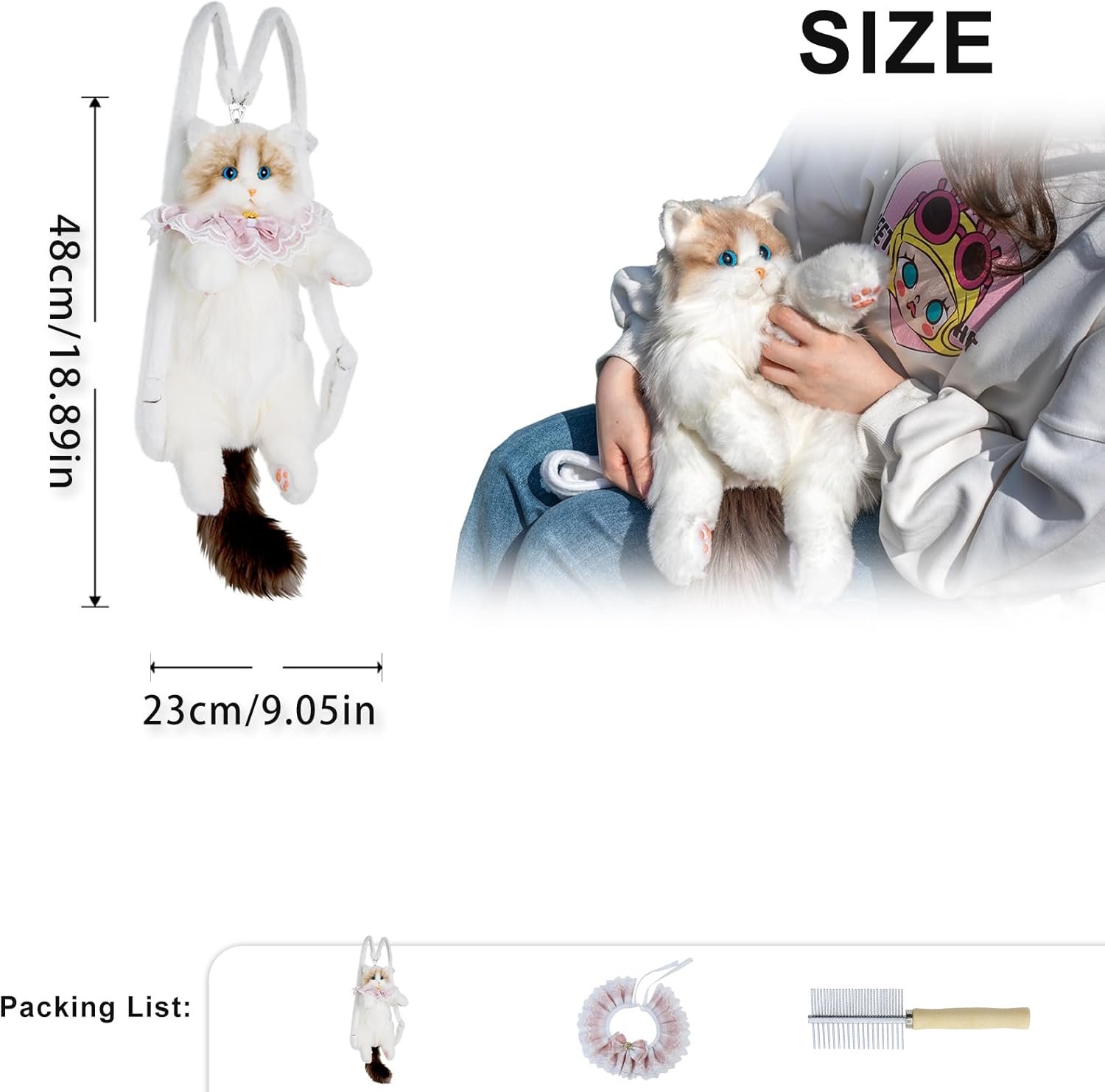 - Packing List: The cat plush bag, a cute ruffled accessory, and a mini comb to keep your “feline friend” looking fluffy.
